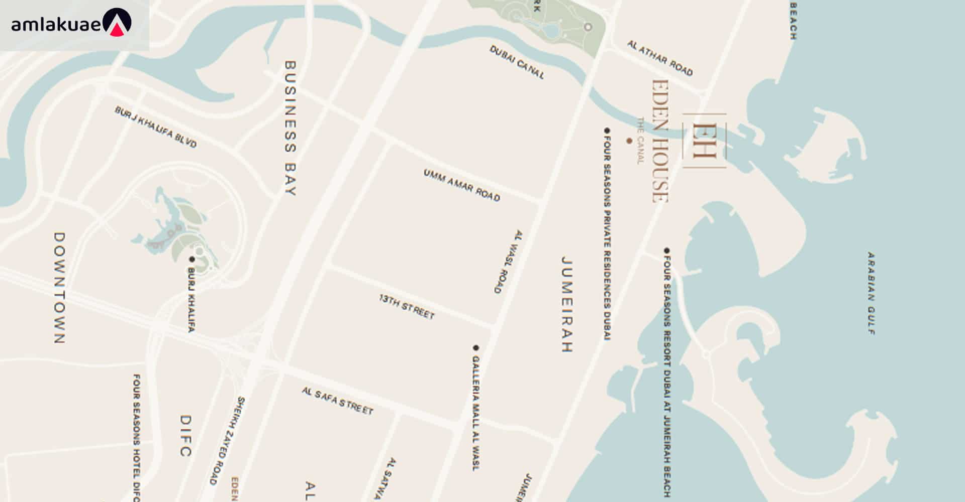 Eden House is one of the few projects that is close to parks and green spaces, the water canal, the beaches, Dubai’s major tourist attractions (Burj Khalifa, Dubai Mall), and the famous Sheikh Zayed Road. On one side, it faces large Emirati villas, which are not accessible to non-Emiratis.