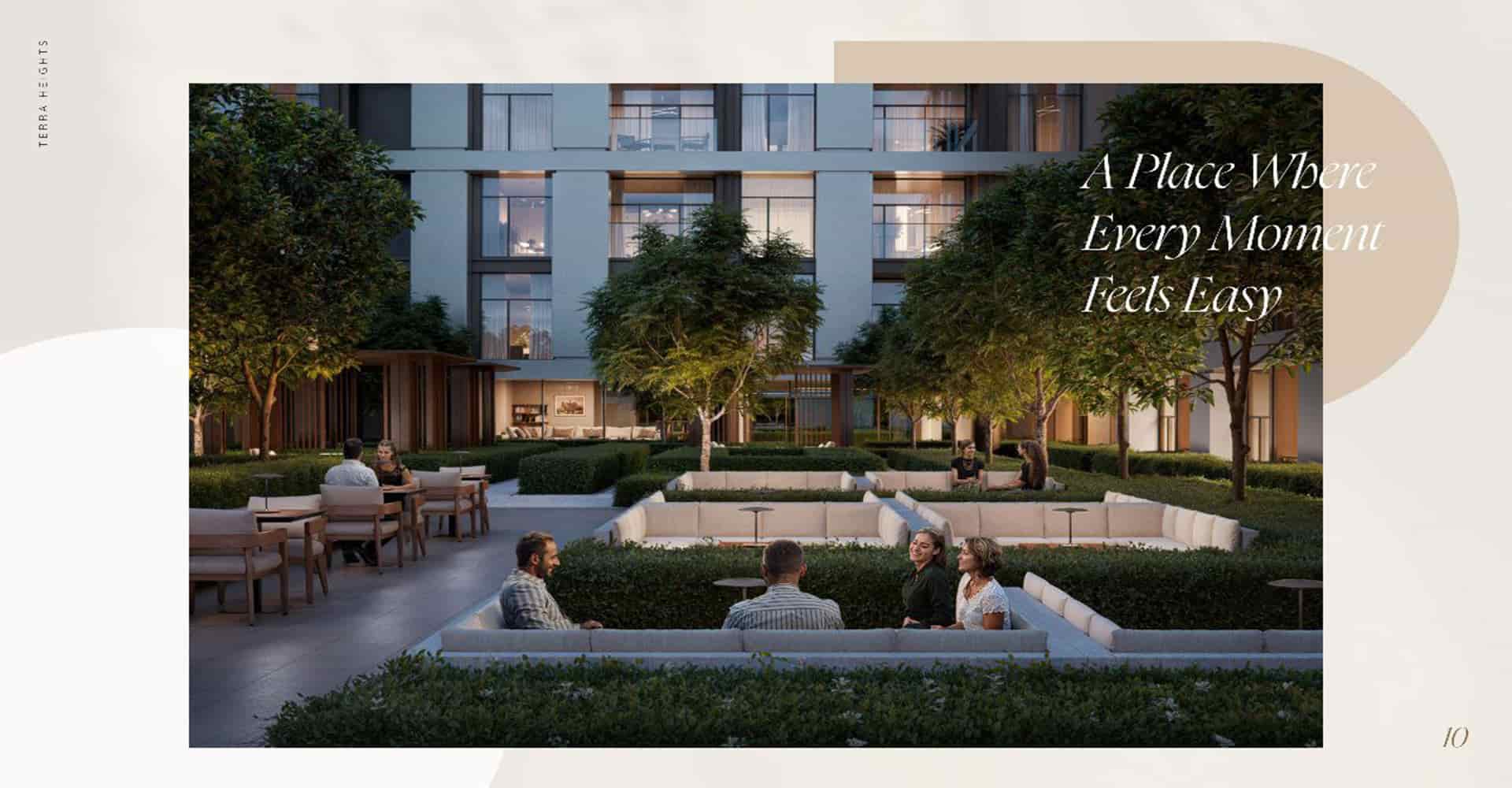 The Terra Heights area is surrounded by landscaped courtyards with adult and children’s swimming pools, yoga platforms, play areas, and relaxation spots.