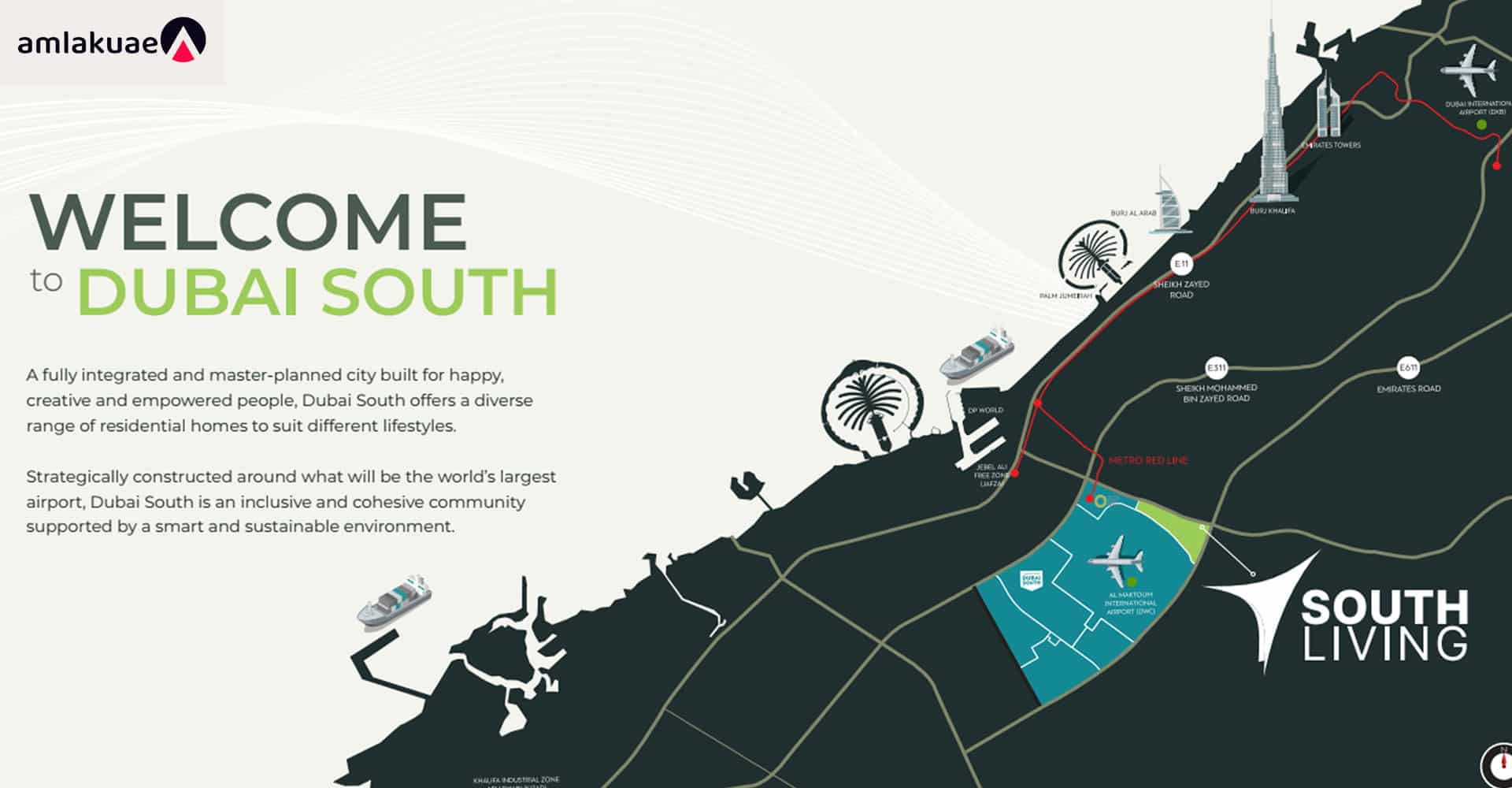 The exclusive community of Dubai South, located near Al Maktoum International Airport, features recreational parks, amenities, and private apartments and villas in Dubai South. The community is completely unique and unified, developed by a single developer, ensuring order and consistent beauty in its design. Join us as we explain everything about purchasing property in Dubai from the South Living collection. Dubai South is close to the Palm Jumeirah beach and Jebel Ali, and is well connected to the Red and main metro lines. These factors are expected to lead to positive growth in property prices within this community.